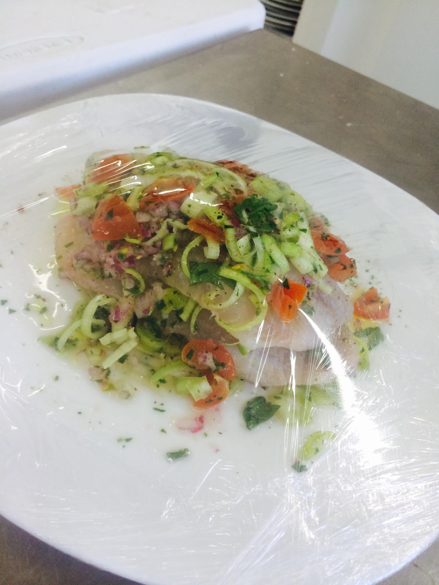 - Colocar em uma prato metade da cebola alho tomate cheiro verde limão e colocar o file de tilápia em cima